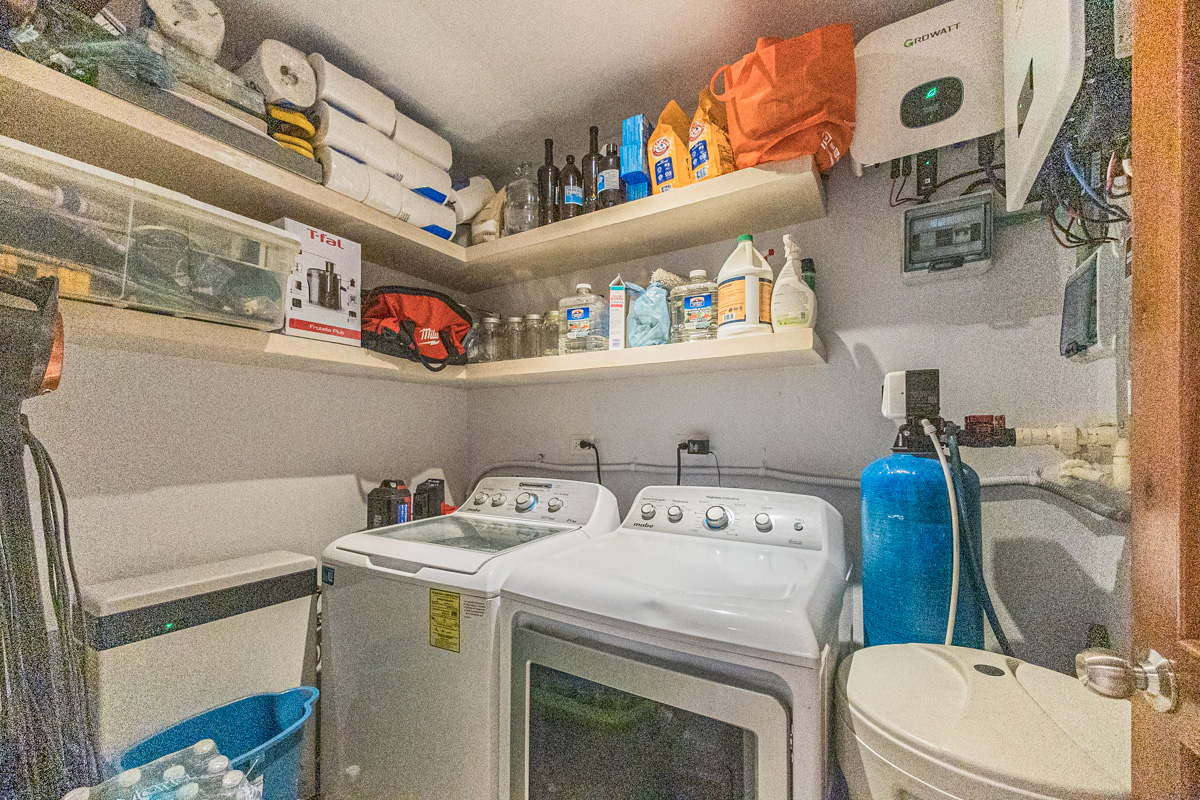 For energy efficiency, this home boasts 16 solar panels coupled with an automatic 2 Lithium battery backup system and an outdoor generator input, ensuring power stability and self- sufficiency—yielding low or even no electric bills!