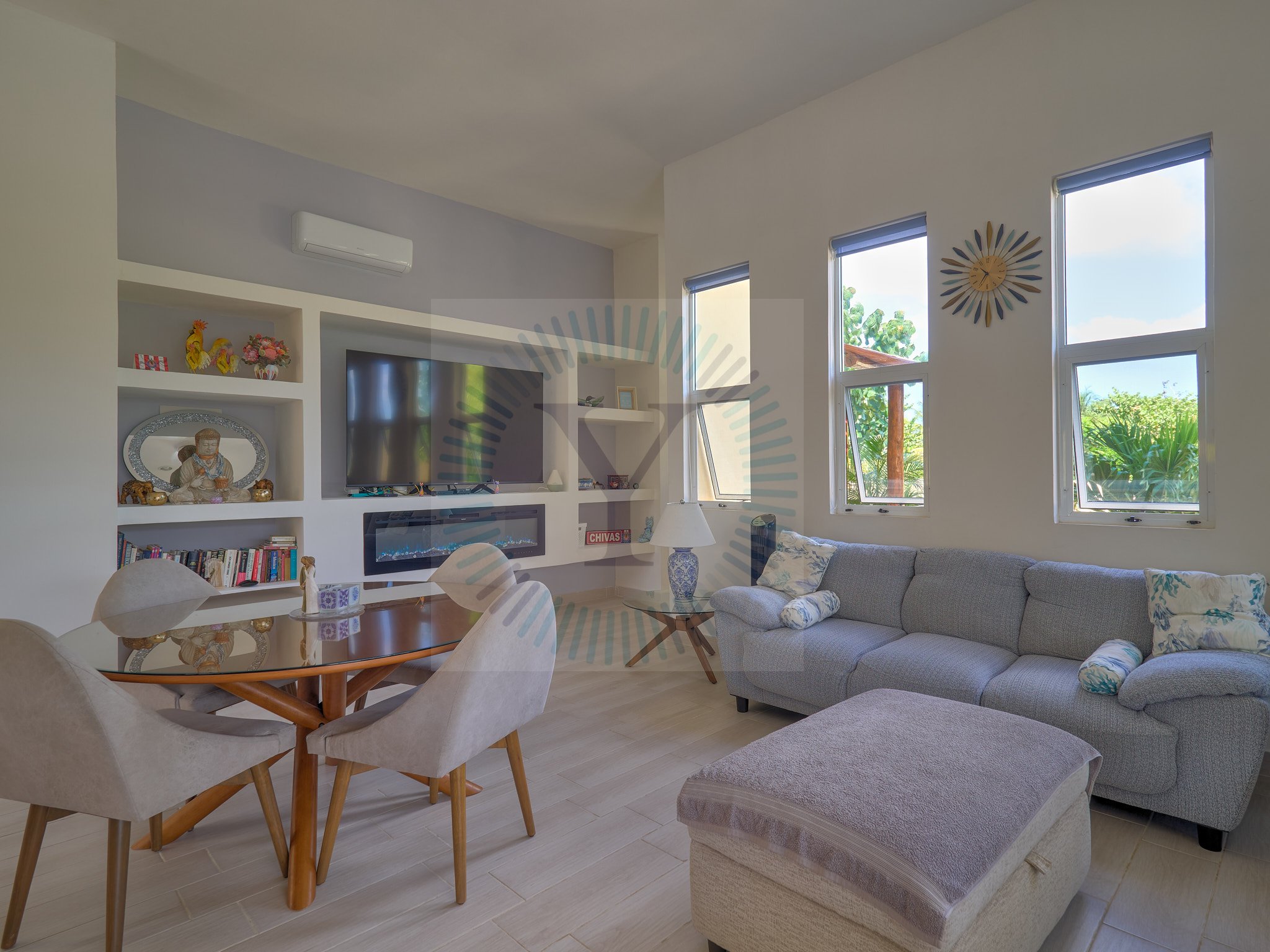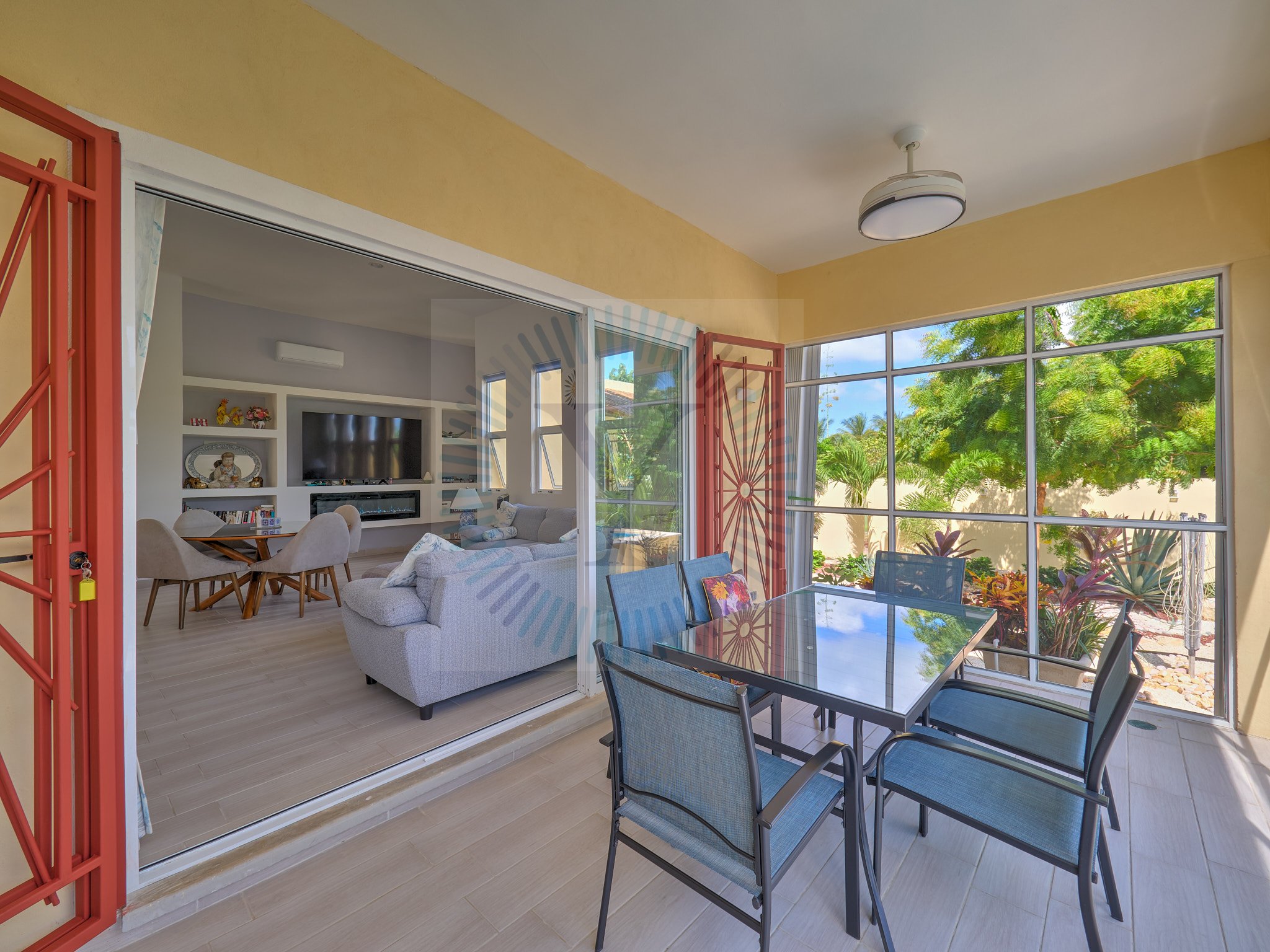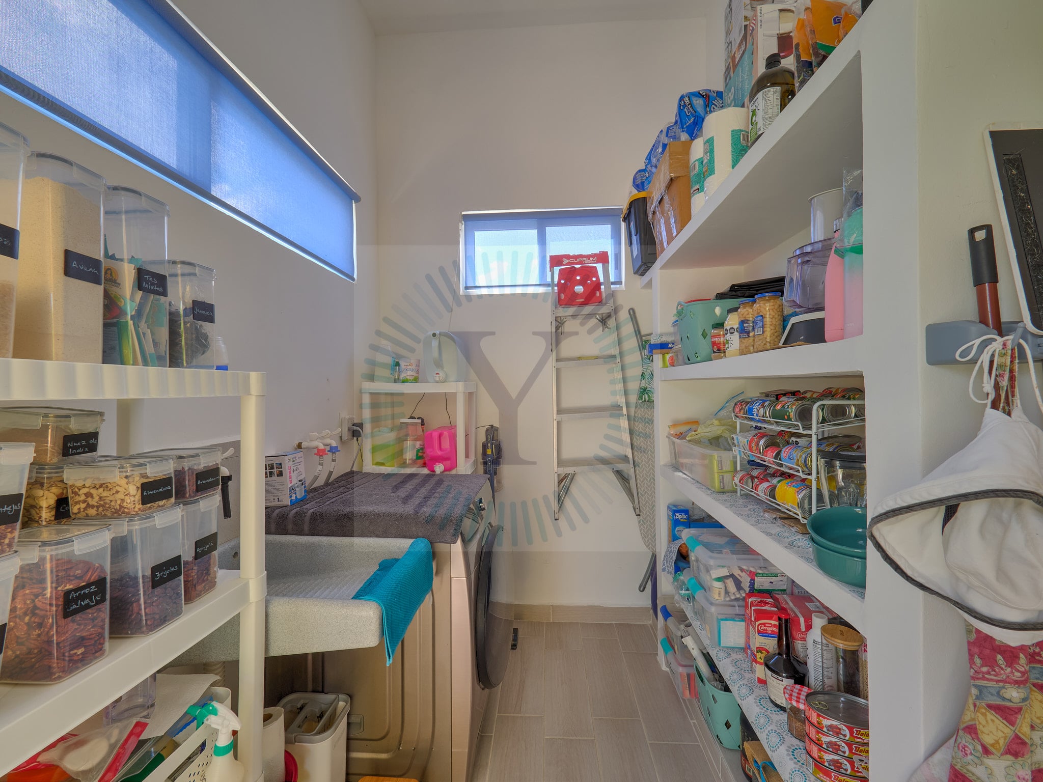 The property is entered through a keyless pedestrian access gate, or automatic opening gates & is surrounded by professionally landscaped, low maintenance gardens. This home is wheelchair accessible. All principal rooms are equipped with fans, air conditioning units & window coverings. The main accommodation is on the ground floor, with an open plan lounge, with double height ceiling for coolness, sliding patio doors lead onto a screened sun terrace overlooking the pool, a feature built in entertainment center incorporates a flame effect electric (fan assisted) fire. The well equipped cook’s kitchen has a window overlooking the front garden & features top of the line stainless steel appliances, including a side by side Samsung refrigerator/freezer, Smeg radiant heat five burner cooktop, a large/deep stainless steel sink (under which is housed a reverse osmosis water filtration system). The kitchen offers a generous & practical arrangement of granite countertops over painted wood cabinets/drawers, (including a pullout pantry cabinet alongside the oven), complemented by an adjacent pantry/laundry room off the kitchen with useful additional storage as well as a stainless steel Samsung washer/dryer, laundry sink, & access to the covered terrace (housing a large BBQ), pool area & rear garden. The kitchen also incorporates a two person breakfast bar, & on the dining area side of the kitchen, additional custom built drawers for extra storage.