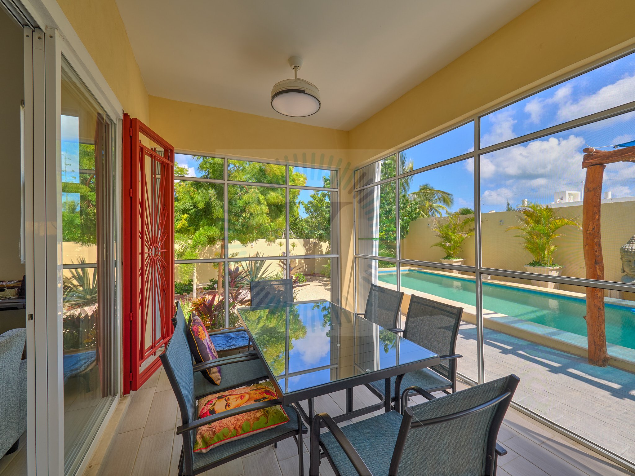 Screened terrace overlooking the pool area, protected by hurricane shutters