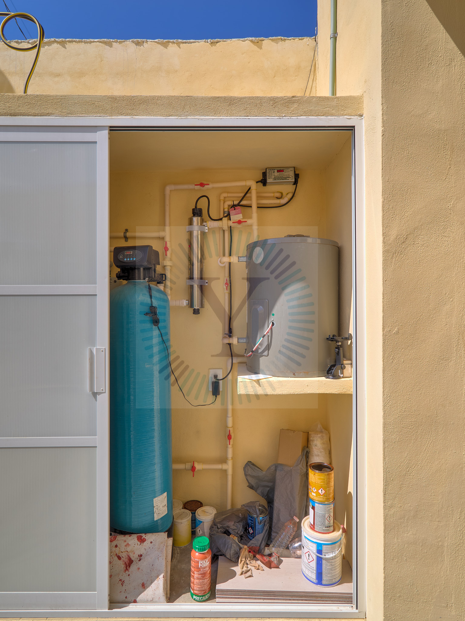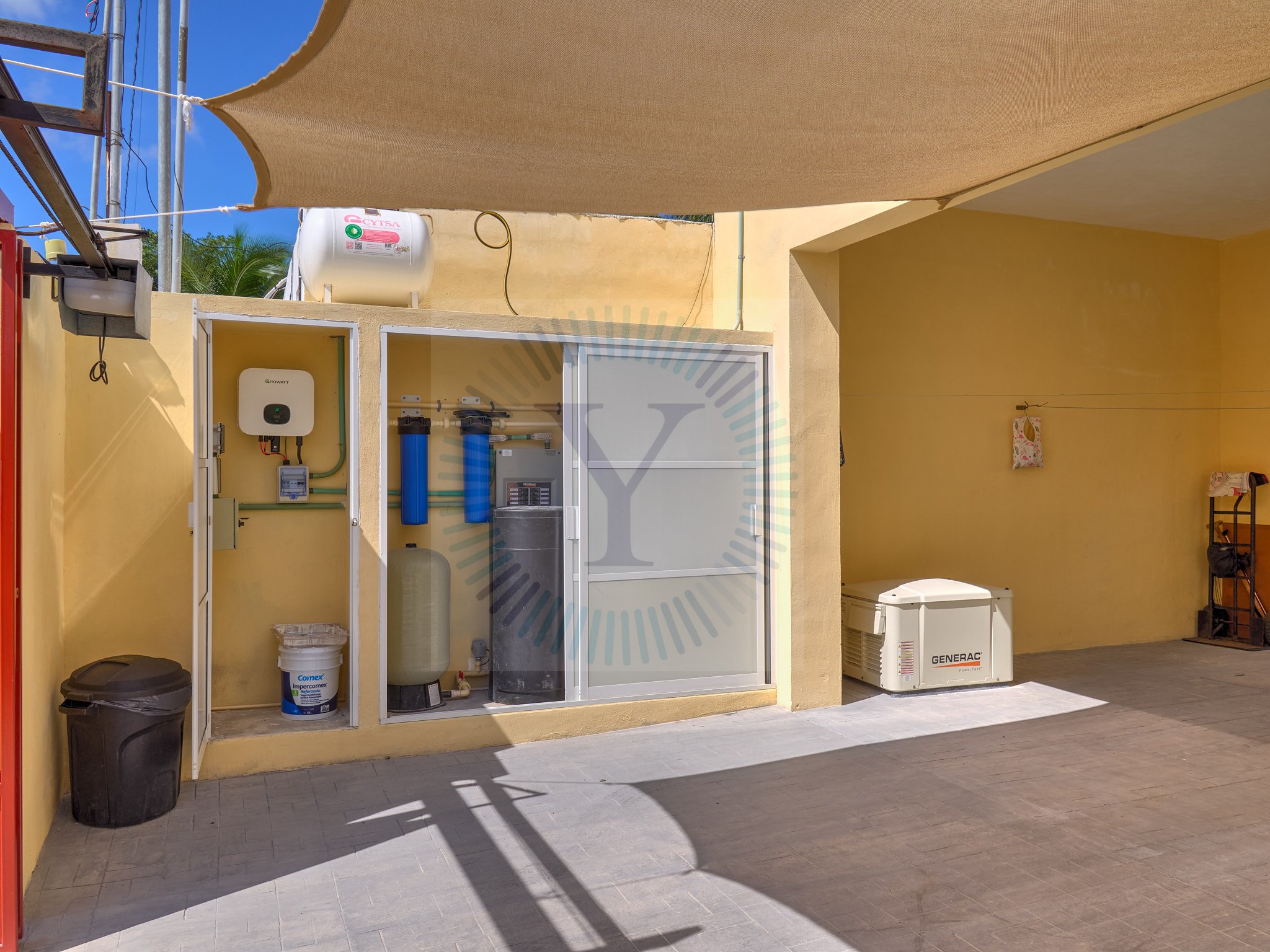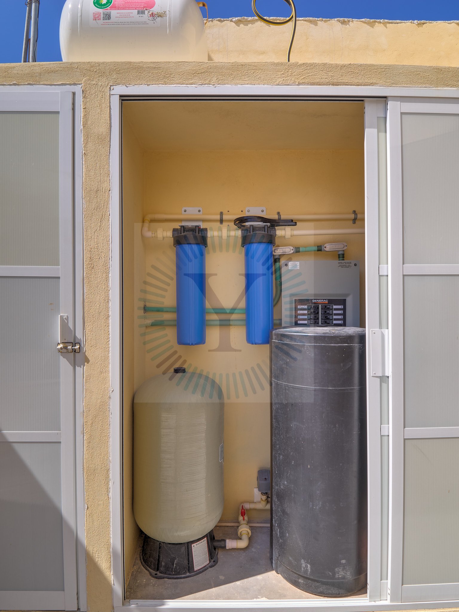 The property has a double, covered carport where the Generac 7.5kw whole house automatic generator is located & a generous sized utility sink, convenient for dog wasshing. To the left of the driveway are sliding door fronted cupboards housing the water filtration & water softening systems, electric hot water heater, whole house surge & low voltage protectors & the solar system box. On top of these concrete cupboards, near the front of the property (for easy filling access), is the stationary gas tank for the generator. A generous 5,000 liter cisterna is housed under the carport. The property has city water, but also a well for filling the pool, which can, in an emergency, feed the cisterna. In addition, the pool has an independent well into which drainage water is siphoned out. The full size pool is 22ft by 8ft & lined in chukum with a tiled top edge & has an automatic pump & filtration system. Off the pool area is an outside screened shower & an adjacent bodega housing the pool pump equipment, garden irrigation controller & also offers a poolside half bath.