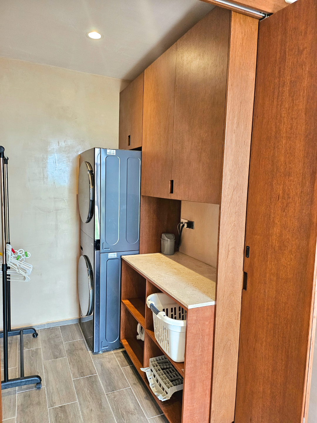 The home showcases custom Brazilian cedar cabinetry, built-in closets, thoughtfully designed custom storage areas, including washer dryer area with custom cabinets. Upgraded bathrooms with high-quality finishes. A whole-house water softener system ensures improved water quality and long-term protection for plumbing and appliances.