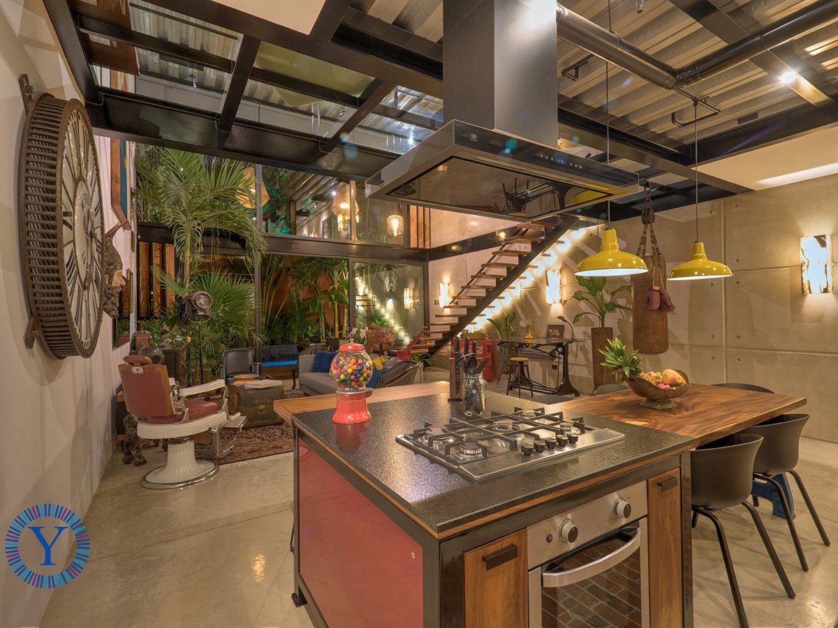 The grand double-height glass wall enhances the open-concept living space and creates a bright and airy atmosphere. The fully equipped chef’s kitchen features custom cabinetry, brick flooring detail, a cooktop with extractor, convection oven, dishwasher, and a new refrigerator.
