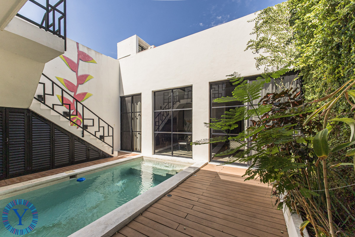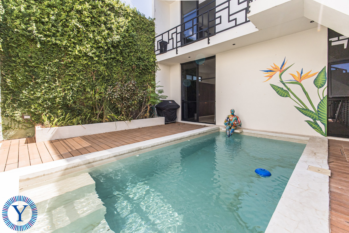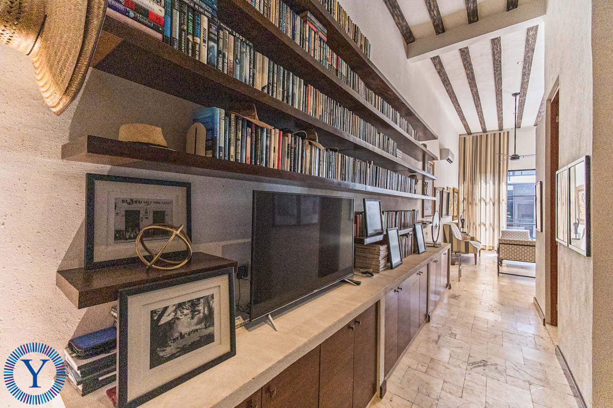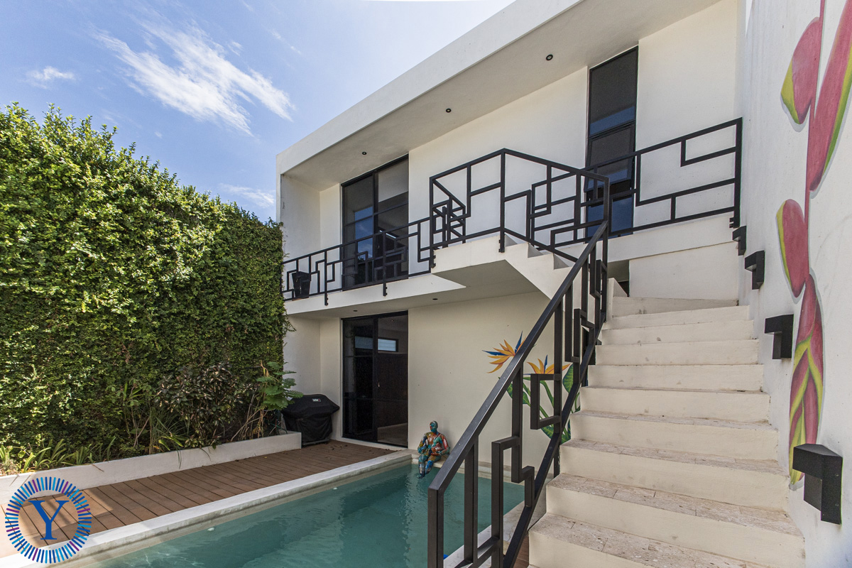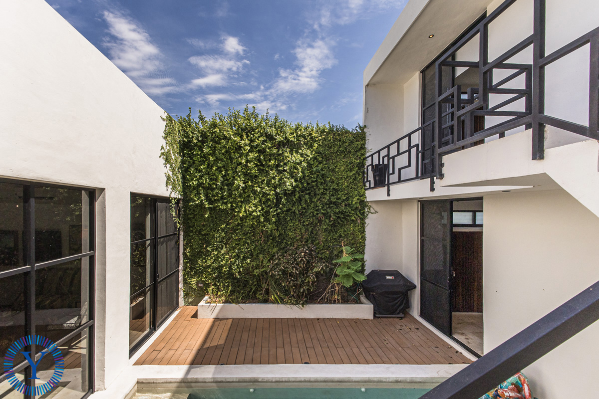 Between the main house and the two-story casita is the beautiful outdoor space with a heated, filtered swimming pool, and a green wall. The casita offers two equal sized bedrooms each one with its own full bathroom and built-in closets.