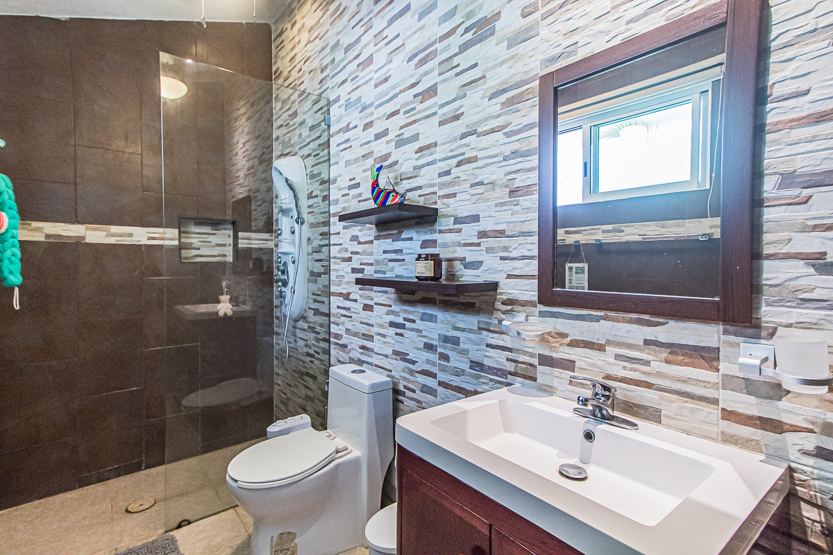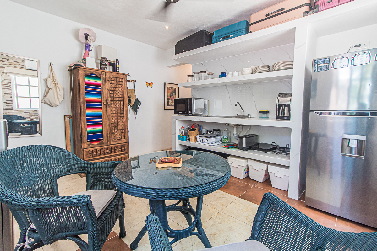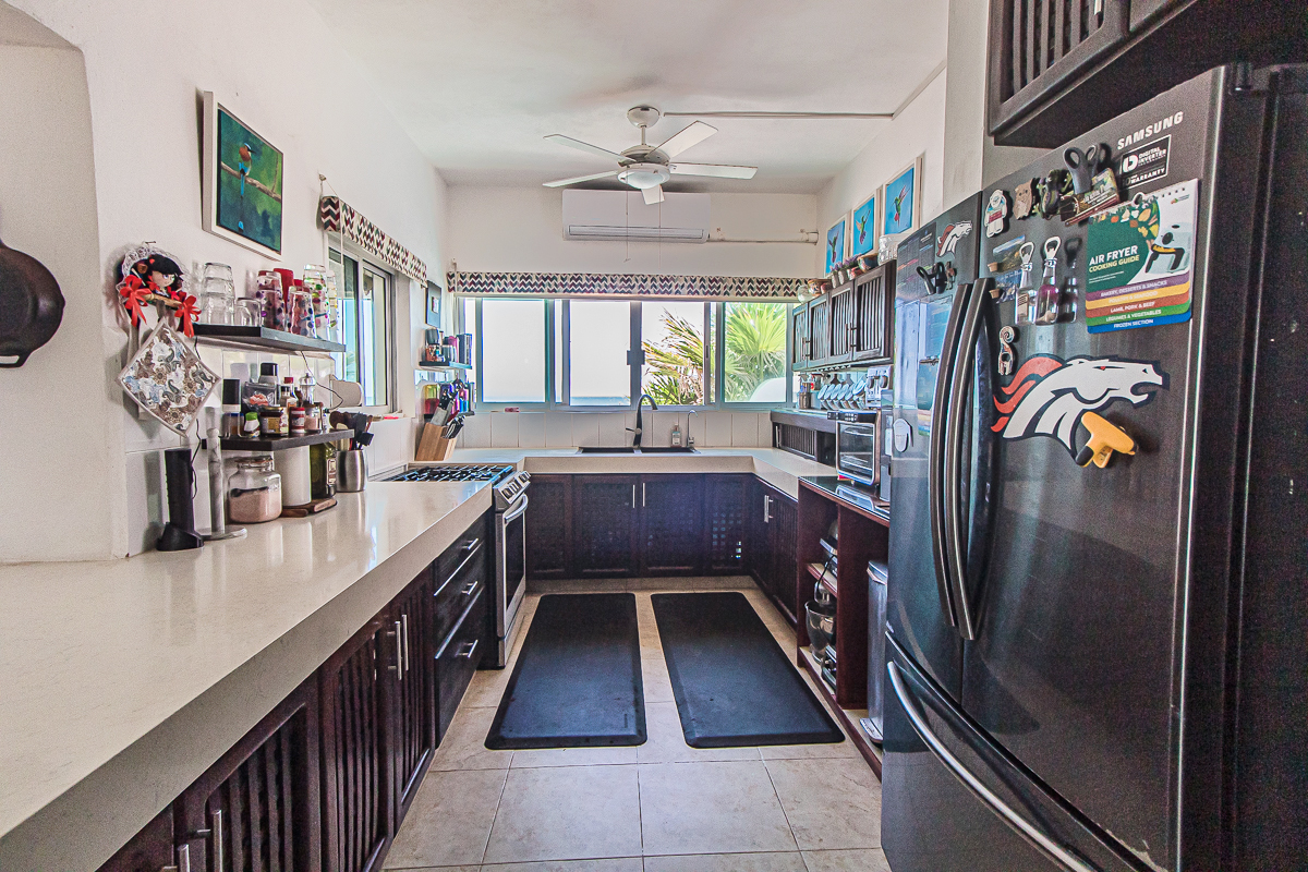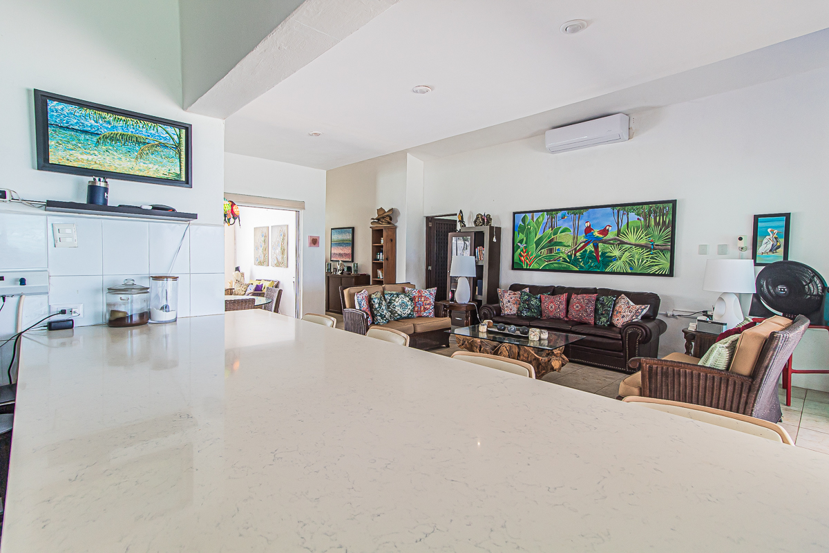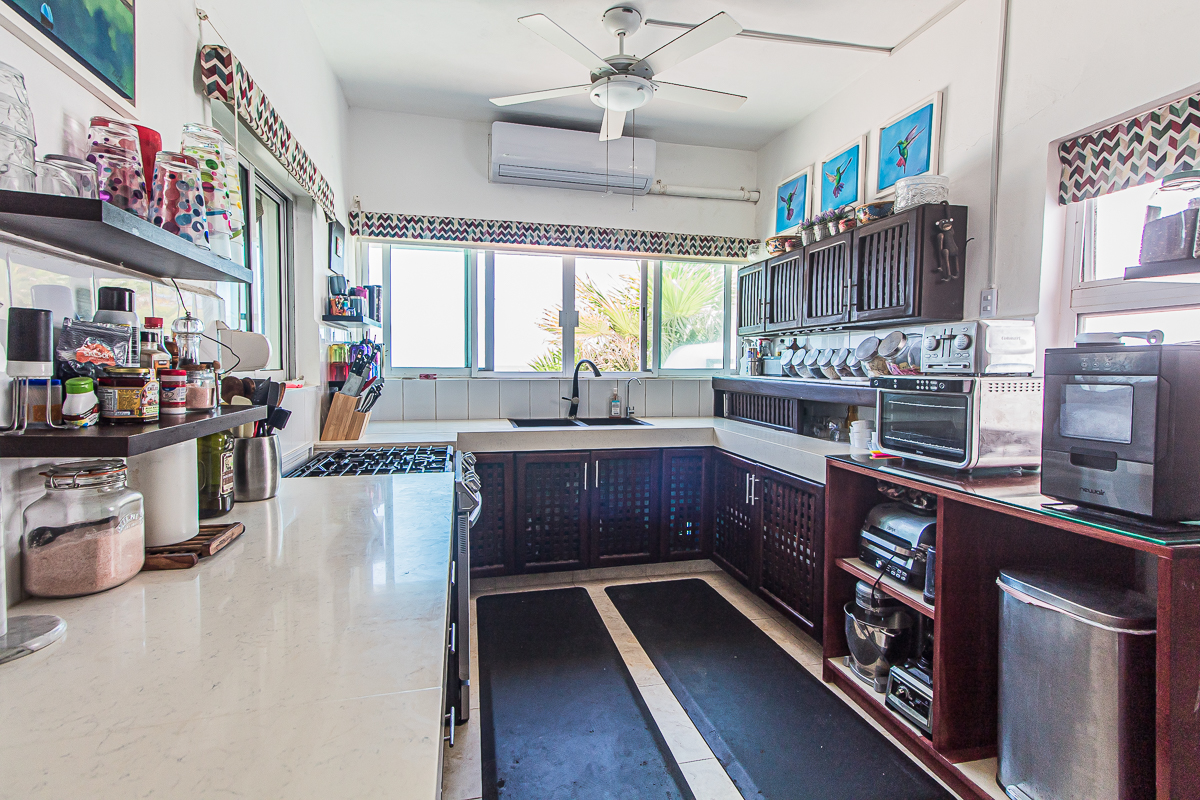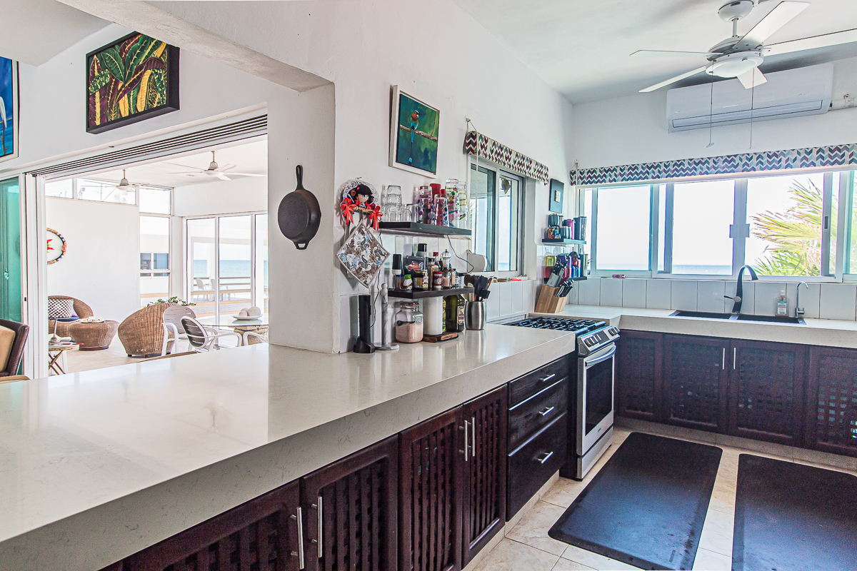 Casa Kukulkan features a spacious kitchen, outfitted with ample storage and a breakfast bar, ideal for casual morning gatherings. The kitchen’s open layout flows into the living space, creating an environment perfect for entertaining or simply enjoying the tranquility of your seaside haven.