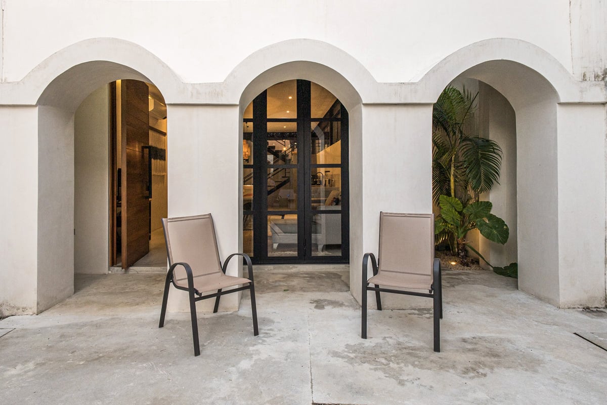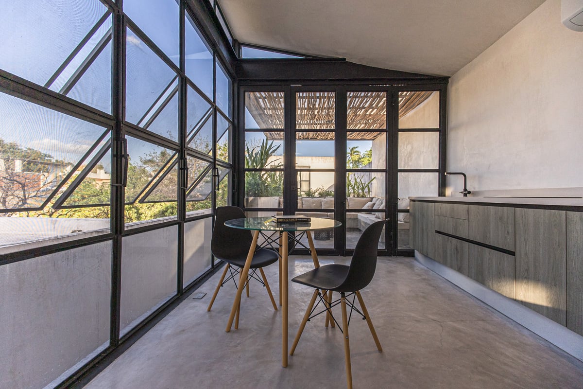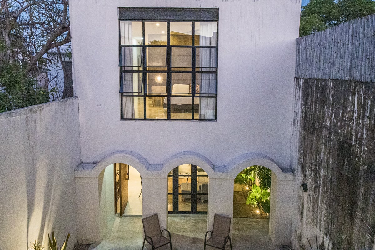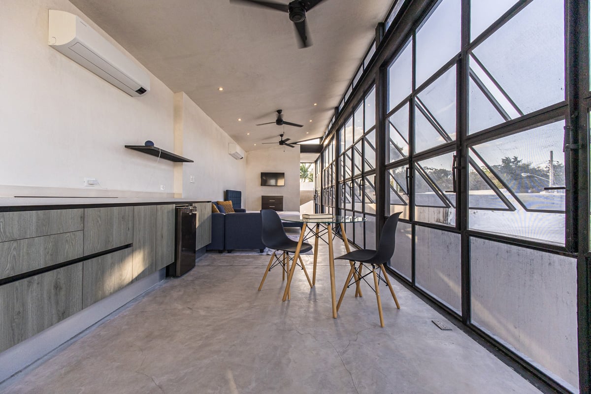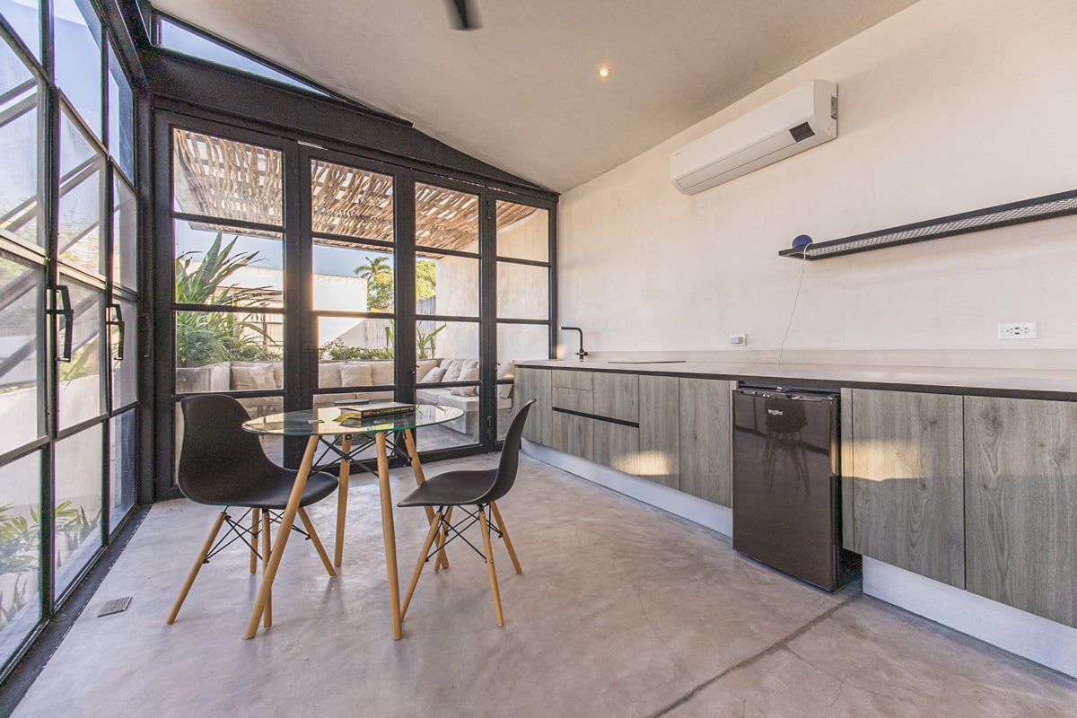 Iron glass doors and windows provide breezes and tons of natural light, the casita integrates two apartments with an elegant open layout design. The downstairs unit features a spacious bedroom that faces the central patio, Tzalam wood deck, and the swimming pool complete with full bathroom, fully equipped kitchen, living and dining areas. Upstairs is a 1 bedroom, 1 full bathroom complete with a private terrace, kitchenette, living and dining area.
