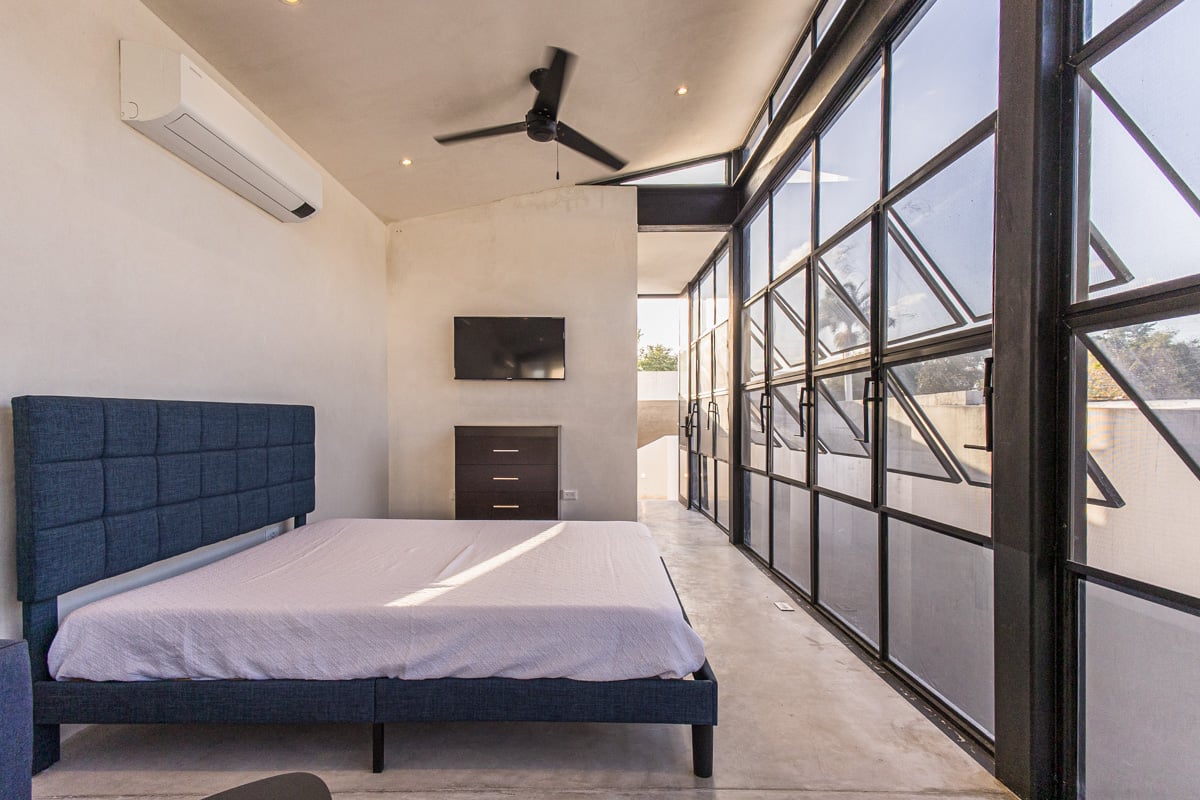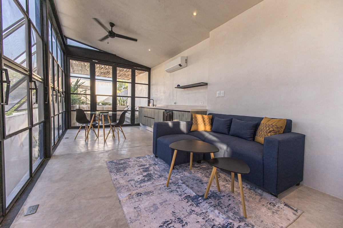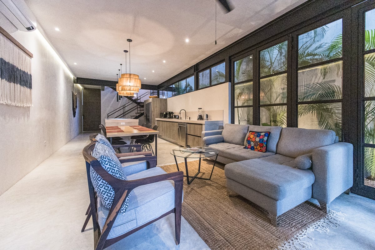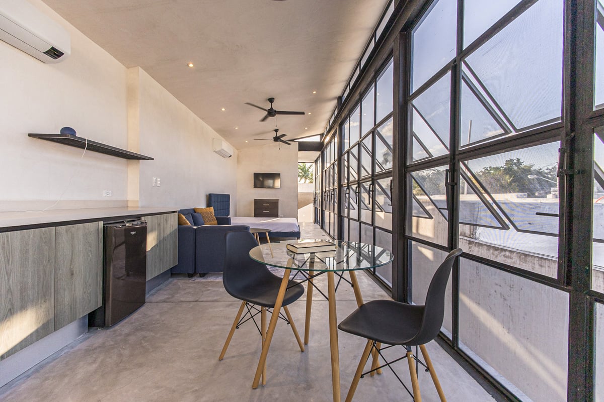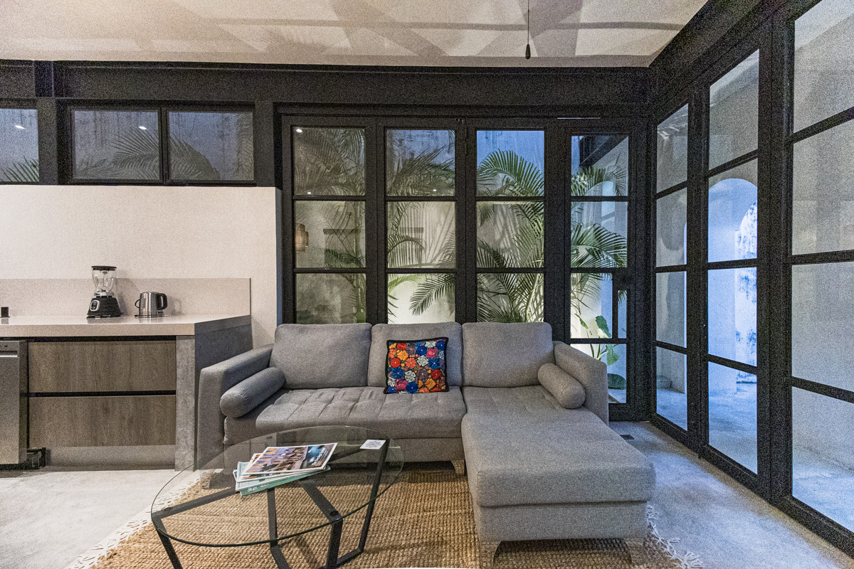 Iron glass doors and windows provide breezes and tons of natural light, the casita integrates two apartments with an elegant open layout design. The downstairs unit features a spacious bedroom that faces the central patio, Tzalam wood deck, and the swimming pool complete with full bathroom, fully equipped kitchen, living and dining areas. Upstairs is a 1 bedroom, 1 full bathroom complete with a private terrace, kitchenette, living and dining area.