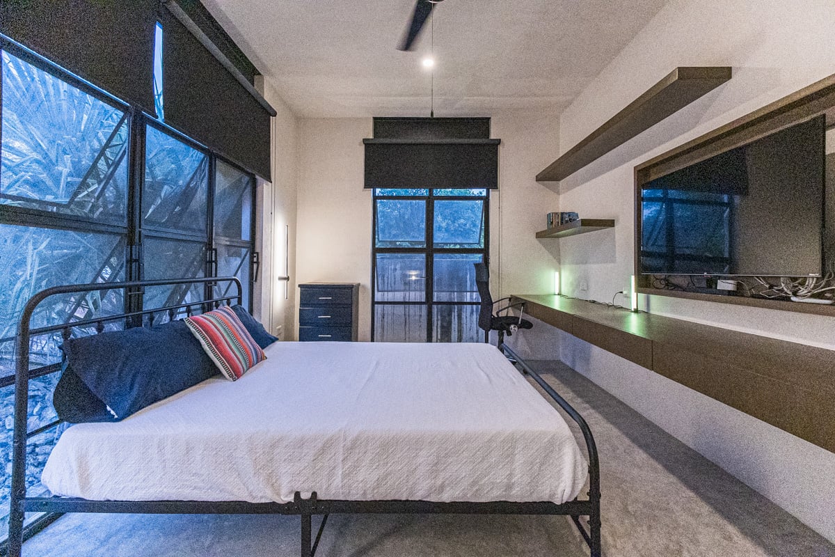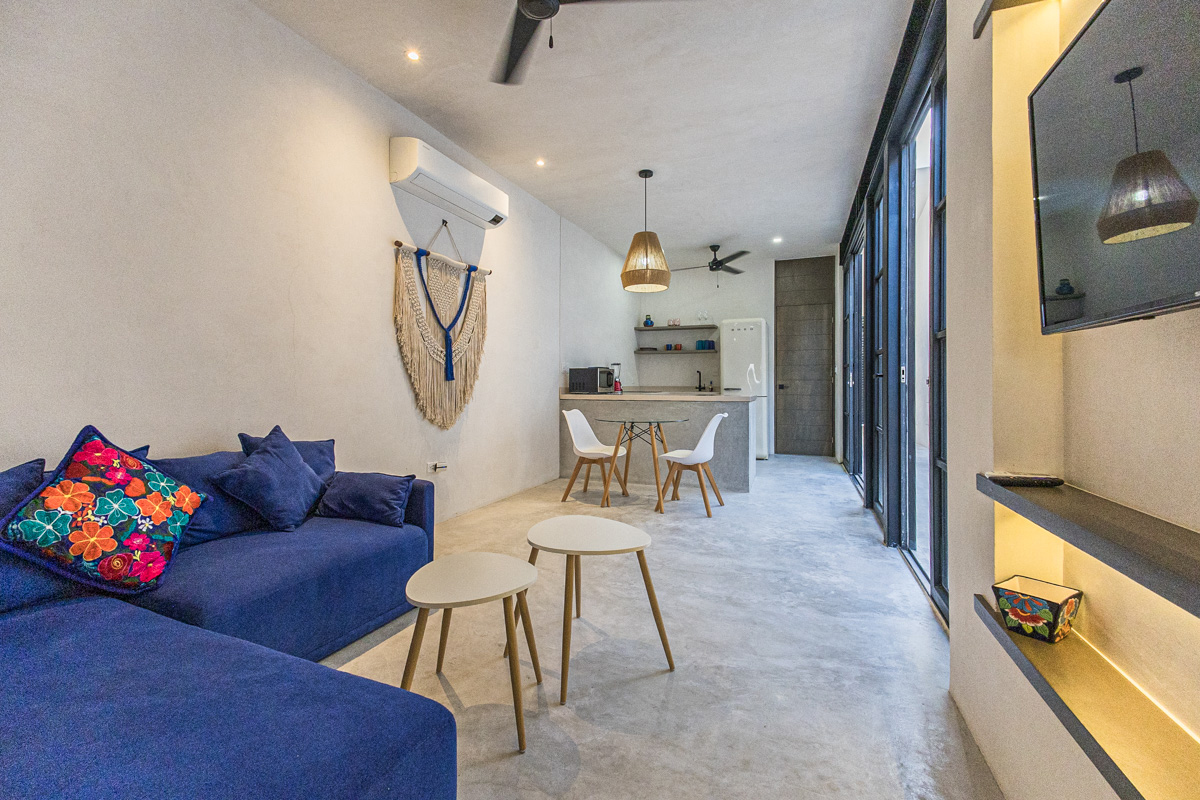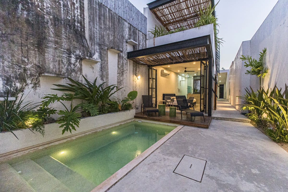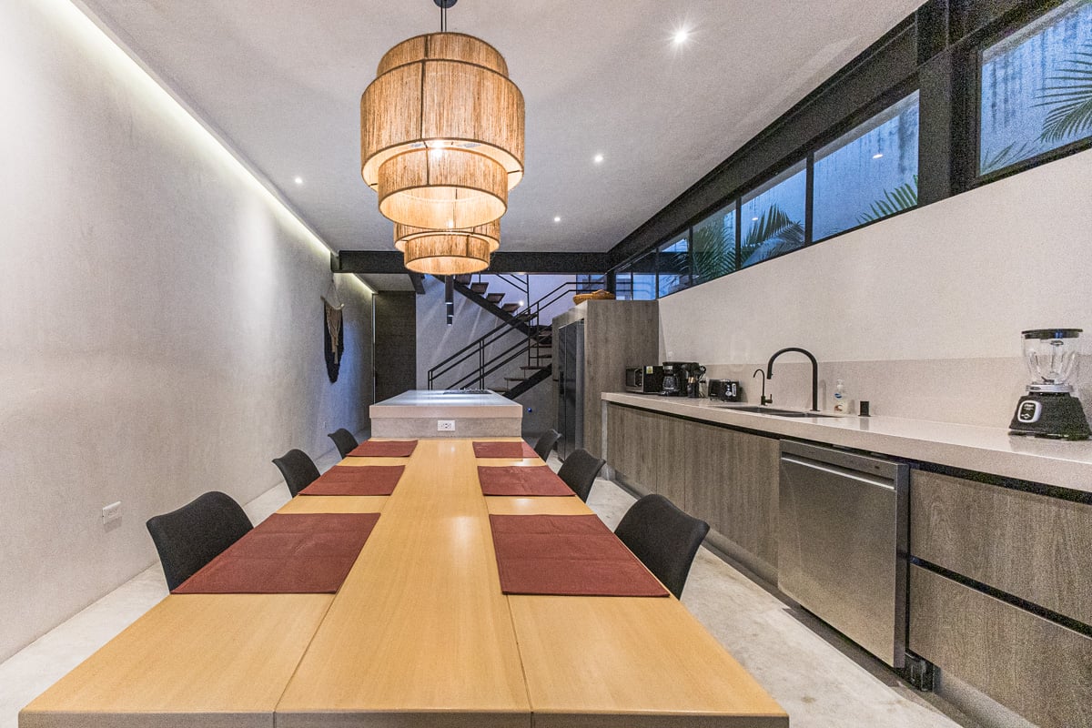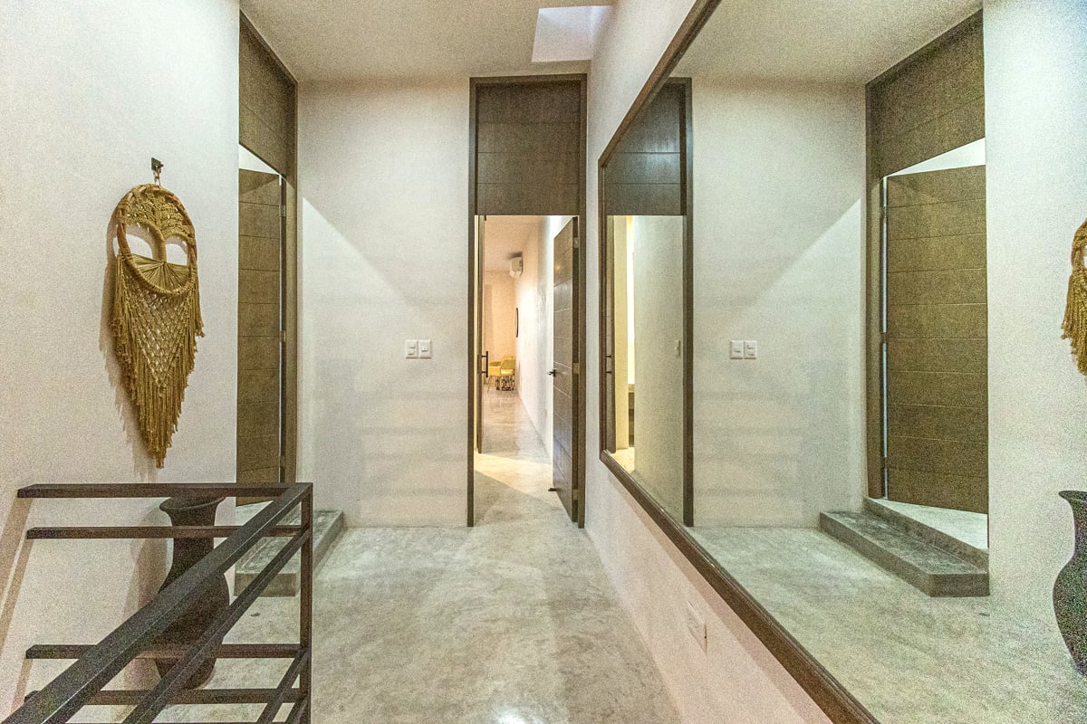 Iron glass doors and windows provide breezes and tons of natural light, the casita integrates two apartments with an elegant open layout design. The downstairs unit features a spacious bedroom that faces the central patio, Tzalam wood deck, and the swimming pool complete with full bathroom, fully equipped kitchen, living and dining areas. Upstairs is a 1 bedroom, 1 full bathroom complete with a private terrace, kitchenette, living and dining area.
