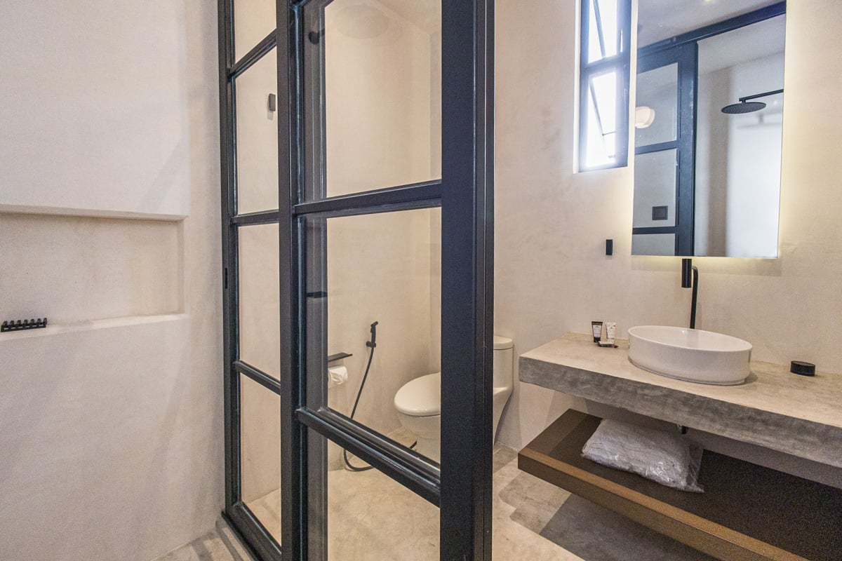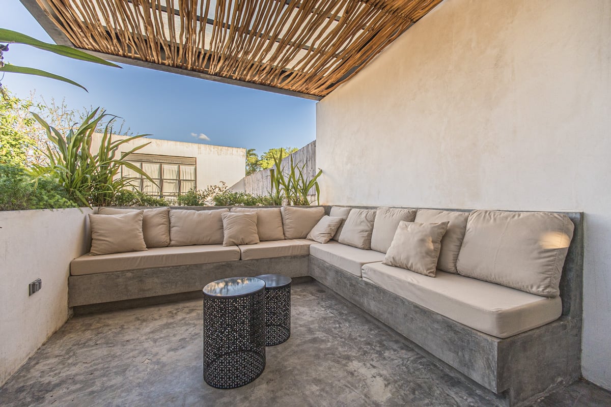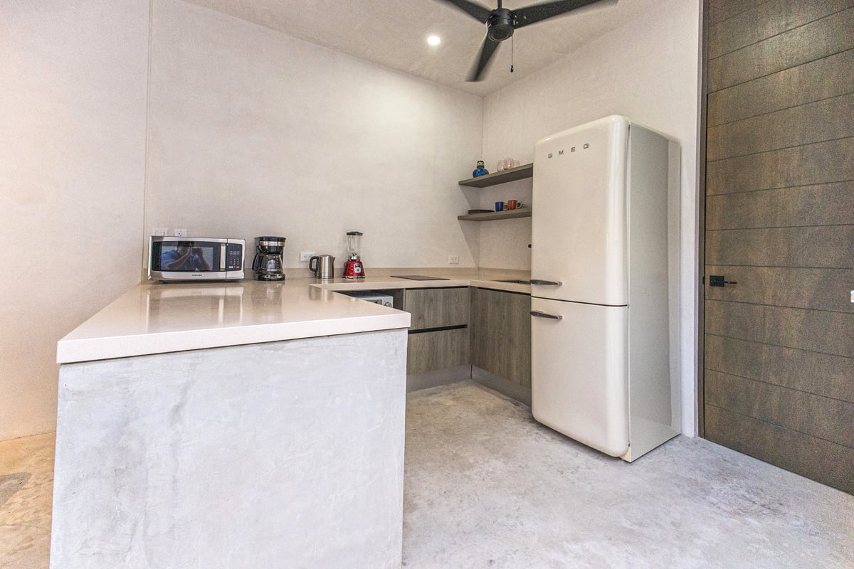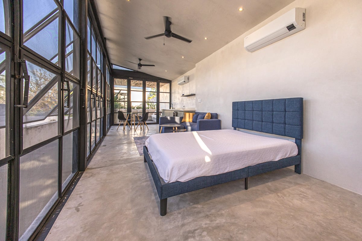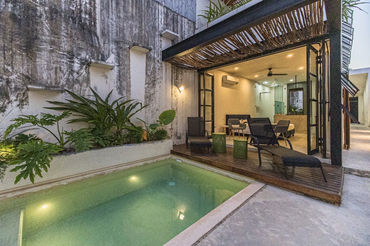 Iron glass doors and windows provide breezes and tons of natural light, the casita integrates two apartments with an elegant open layout design. The downstairs unit features a spacious bedroom that faces the central patio, Tzalam wood deck, and the swimming pool complete with full bathroom, fully equipped kitchen, living and dining areas. Upstairs is a 1 bedroom, 1 full bathroom complete with a private terrace, kitchenette, living and dining area.