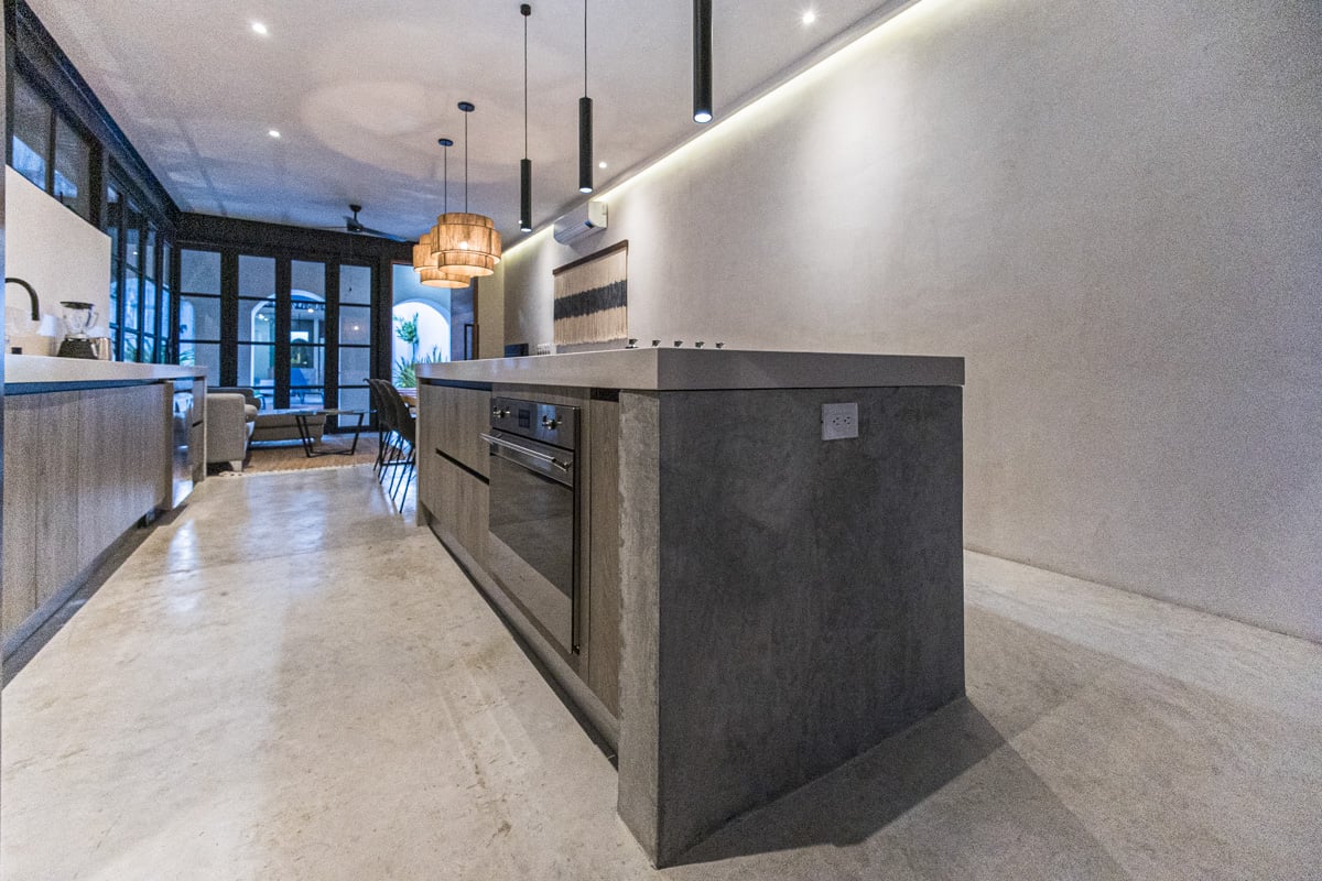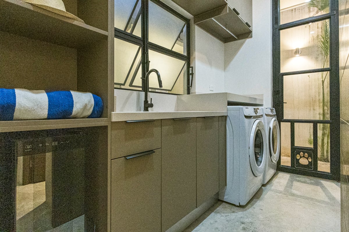 The stunning 2 bedroom, 2.5 bathroom main house flanked by arches welcomes another open concept living space which encompasses the living room, dining room, half bath, and equipped kitchen complete with custom made cabinets and a terrazzo island. At the rear is the large utility room containing all the home equipment, laundry room and space for storage.