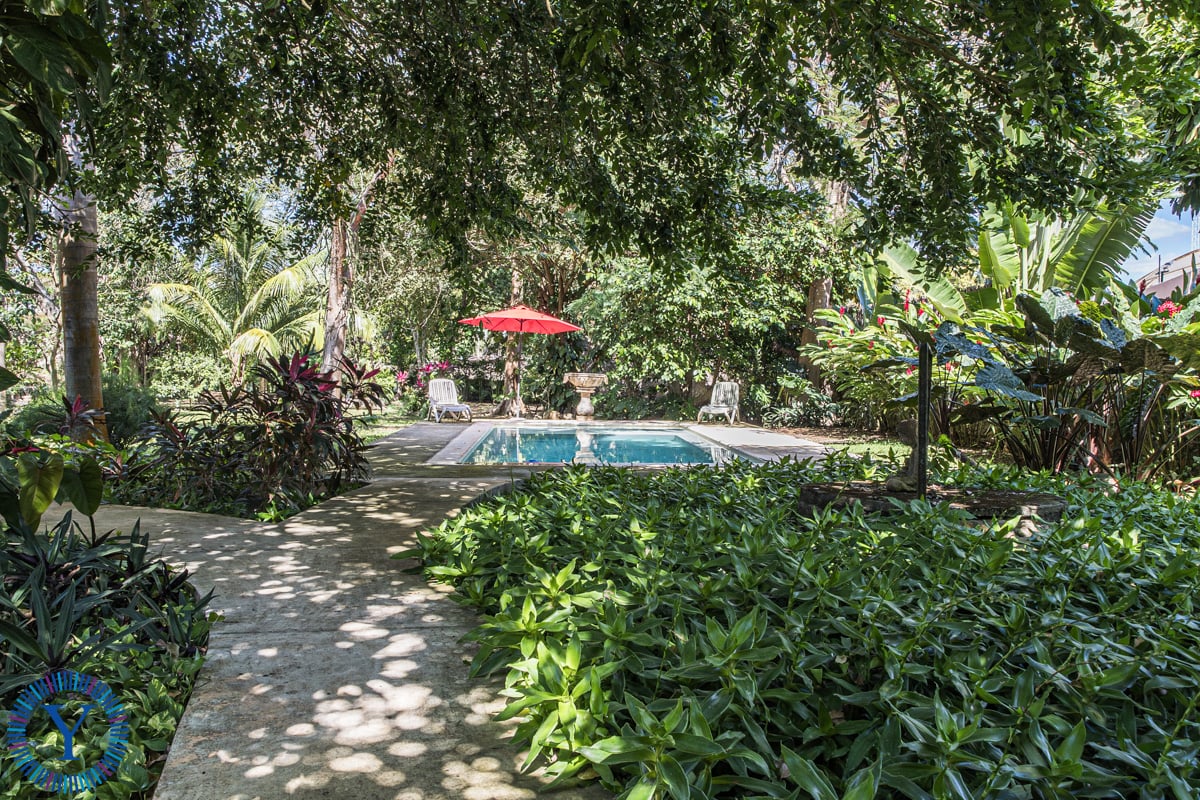 Beyond the mampostería walls, a lush garden sanctuary awaits. Mature trees shade meandering paths leading to a sparkling filtered swimming pool alongside a veranda. This generous lot size offers endless possibilities for outdoor living and entertainment.